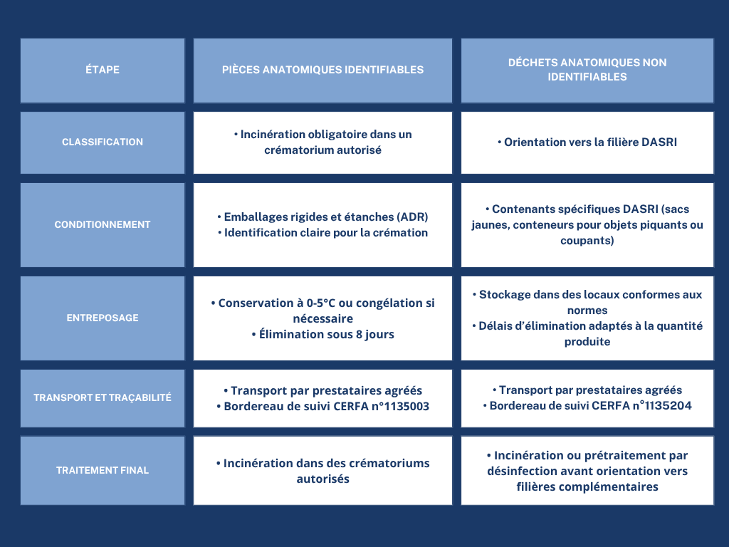 La gestion des pièces et déchets anatomiques d’origine humaine suit plusieurs étapes clés, permettant de classer, conditionner, stocker, transporter et traiter les déchets en toute sécurité. Le tableau ci-dessous résume ces étapes en distinguant les pièces anatomiques identifiables et les déchets non identifiables :