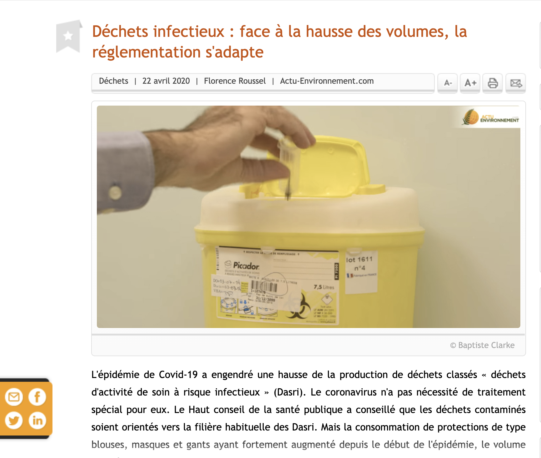 L’épidémie de Covid-19 a engendré une hausse de la production de déchets classés « déchets d’activité de soin à risque infectieux » (Dasri). Le coronavirus n’a pas nécessité de traitement spécial pour eux. Le Haut conseil de la santé publique a conseillé que les déchets contaminés soient orientés vers la filière habituelle des Dasri. Mais la consommation de protections de type blouses, masques et gants ayant fortement augmenté depuis le début de l’épidémie, le volume des déchets a suivi la…