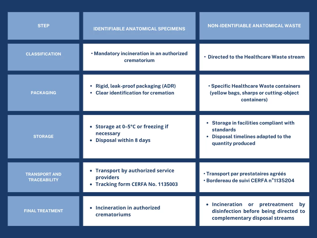The management of anatomical specimens and waste relies on key steps: classification, packaging, storage, and final treatment. Distinguishing identifiable specimens from non-identifiable waste allows for the adoption of the appropriate disposal route: authorized cremation or secure Healthcare Waste treatment.