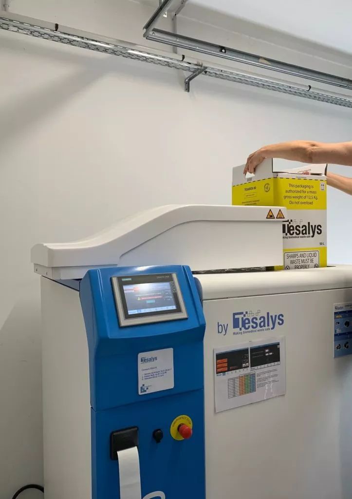 Por ejemplo, los sistemas STERIPLUS™ y STERISHRED® de la empresa Tesalys permiten triturar y esterilizar los desechos directamente en el lugar, reduciendo así el volumen de los desechos, eliminando los riesgos infecciosos y facilitando la trazabilidad.