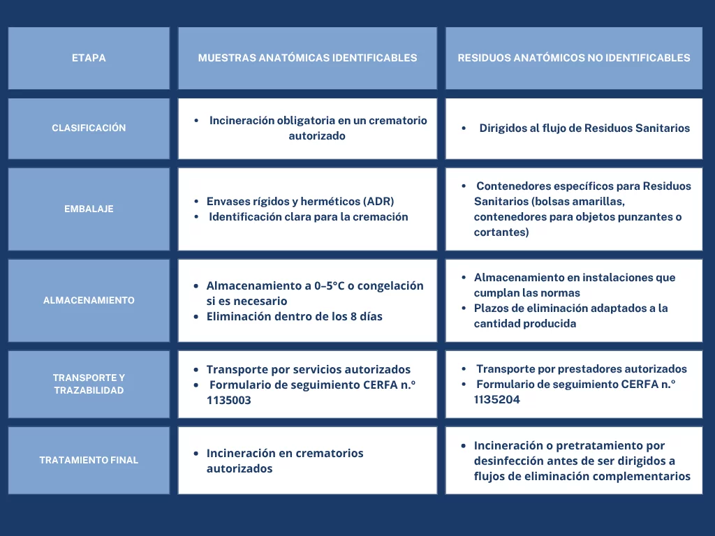 La gestión de las piezas y desechos anatómicos de origen humano sigue varias etapas clave, que permiten clasificar, acondicionar, almacenar, transportar y tratar los desechos de manera segura. La siguiente tabla resume estas etapas distinguiendo entre las piezas anatómicas identificables y los desechos no identificables: